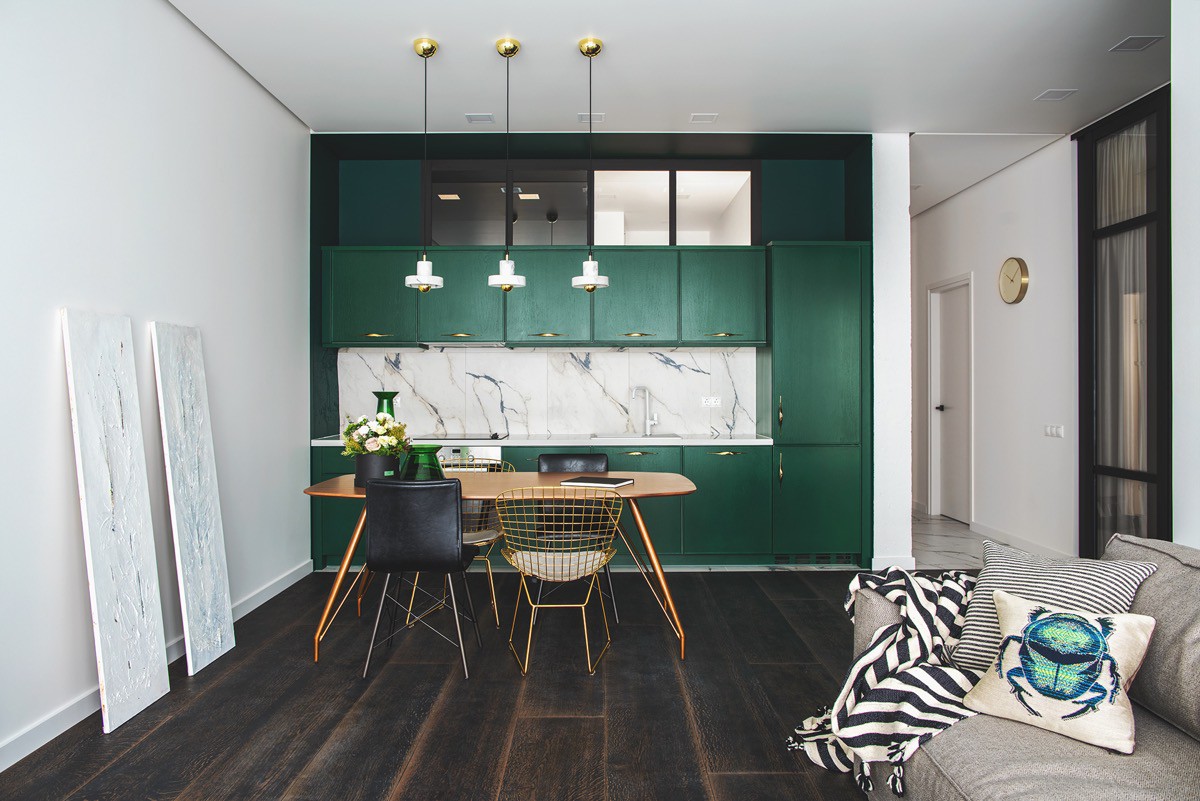 Bức tường phía sau nhà bếp màu xanh lá cây này được sơn cùng một bóng tối, và các bức tranh trải dài dọc theo bức tường bên.