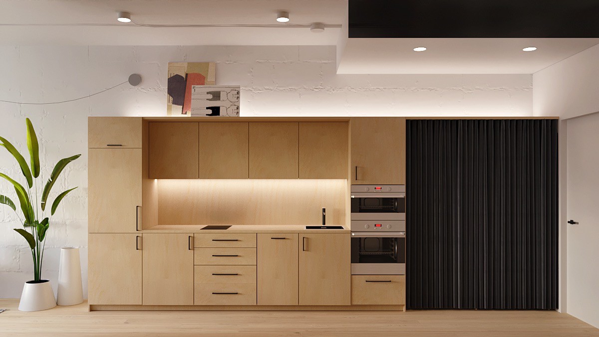 Thiết kế nhà bếp màu đen và gỗ minh họa dải ánh sáng đơn có thể làm nổi bật không gian nhà bếp rõ ràng.