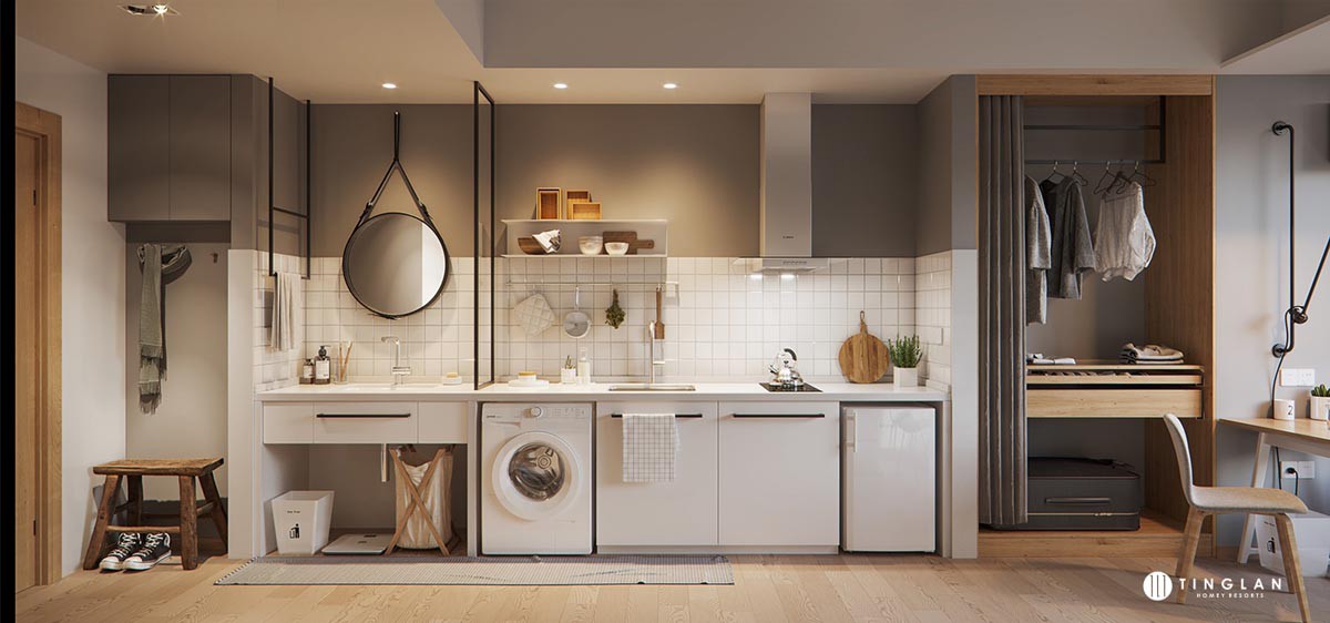 Nếu bức tường nhà bếp có sẵn không đủ dài hãy sử dụng thêm trần nhà. Với trần nhà cao, bạn có thể lắp đặt tường đôi để tăng dung lượng lưu trữ.