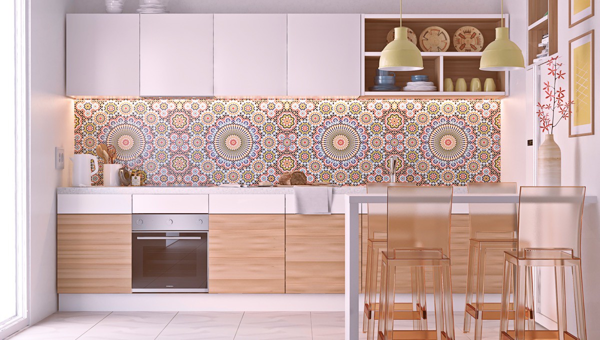Tủ trơn được phối hợp ăn ý với một chiếc backsplash đầy màu sắc có hoa văn tạo nên tường nhà bếp tuyệt đẹp.
