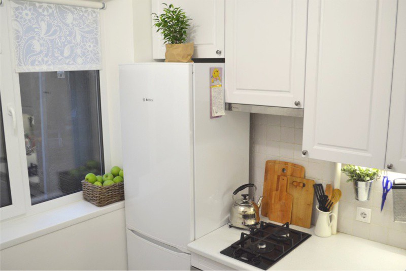 Tủ lạnh tích hợp bên cạnh bếp gas mini ở bên trong phòng khách-nhà bếp được thiết kế lại ở Khrushchev.