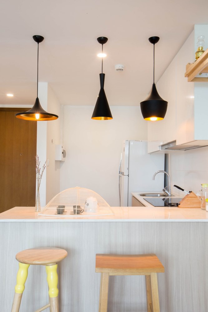 Không gian bếp núc cũng được xử lý rất khéo léo và thông minh. Vốn không phải người dành nhiều thời gian cho bếp núc nên KTS và chủ nhà đã thiết kế khu vực này rất đơn giản với bếp và bồn rửa bố trí liền kề. Song song với đó là hệ bàn bar tạo ra vách ngăn cho khu nấu nướng và khu khách - ngủ. Bàn bar này vừa tích hợp thêm ngăn lưu trữ, vừa "giấu" được chiếc máy giặt thật khéo léo. Tất nhiên chất liệu gỗ công nghiệp sáng màu cũng góp công lớn trong việc đem đến cho nơi này một không gian ấm cúng, sạch sẽ và gọn gàng.