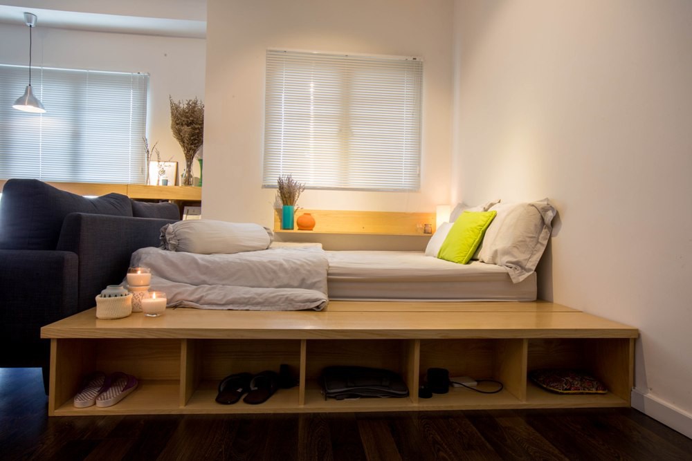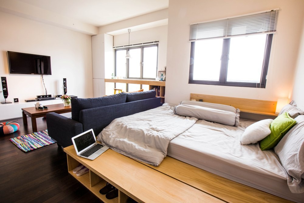 Căn hộ này vốn là dạng căn hộ studio vốn khá phổ biến ở nước ngoài với đặc điểm là ngoài khu vệ sinh, tất cả các không gian chức năng khác đều bố trí trên một mặt bằng chứ không phân chia như các không gian thông thường.
