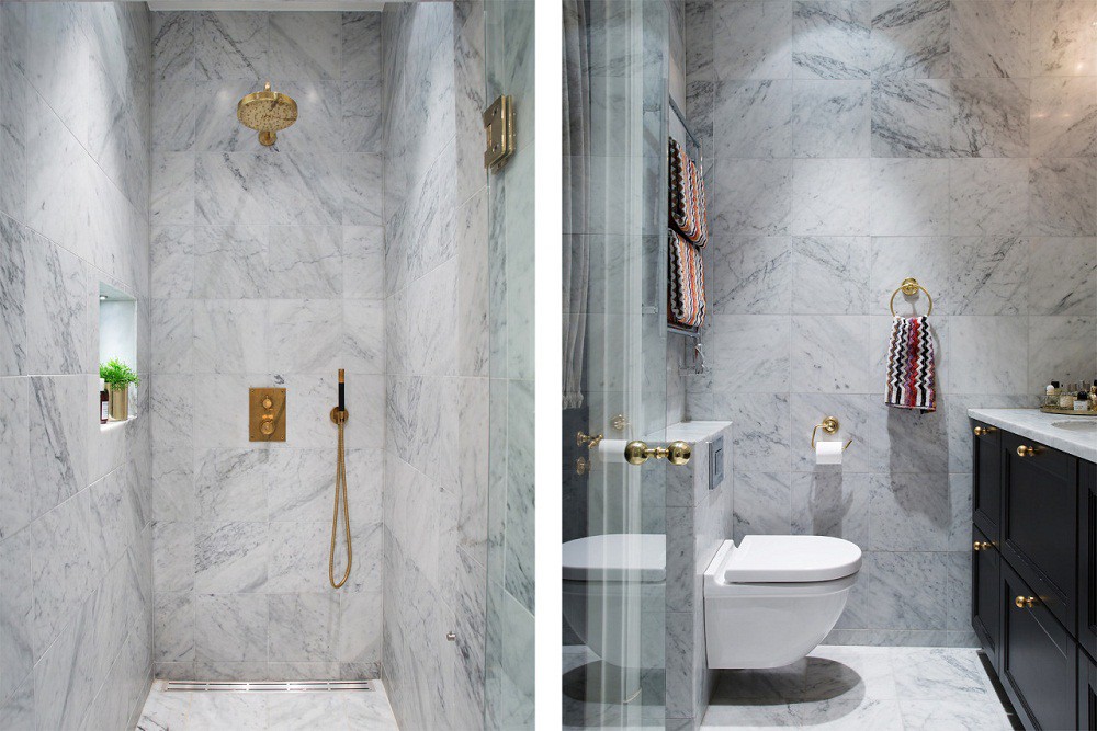 Khác với nhà bếp và phòng khách, những không gian riêng tư như phòng ngủ hay nhà tắm được thiết kế với một diện tích vừa phải. Phòng ngủ lựa chọn bộ tủ với sắc đen mun trông cực sang. Giấy dán tường hoa tiết lại khiến cho căn phòng sinh động hơn để cân đối với sắc đen hơi lạnh và trầm. Đồng nhất với phong cách hiện đại và tinh tế của căn hộ, vậy nên nhà tắm cũng không ngoại lệ. Việc ốp hoàn toàn bằng đá cẩm thạch, thậm chí còn khiến căn phòng có cảm giác khá sang.