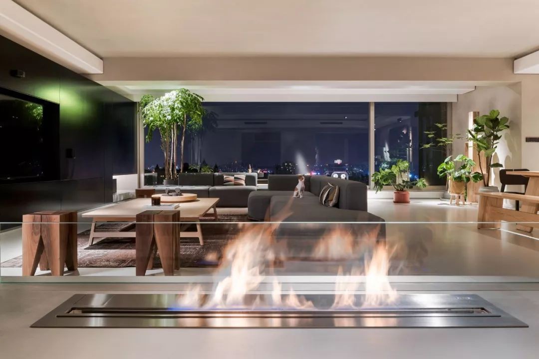 Phòng khách là nơi anh Gu Teng yêu nhất. Không gian phòng khách được bố trí ở khung cửa kính rộng lớn, đủ để từ bên trong có thể ngắm gần như cả bức tranh tuyệt đẹp của thành phố. Không gian sống ấy tuy đơn giản nhưng từng nội thất, vật dụng hay phụ kiện trang trí đều được anh thiết kế khá ấn tượng, chọn lựa kỹ lưỡng trong khoảng 2 năm.