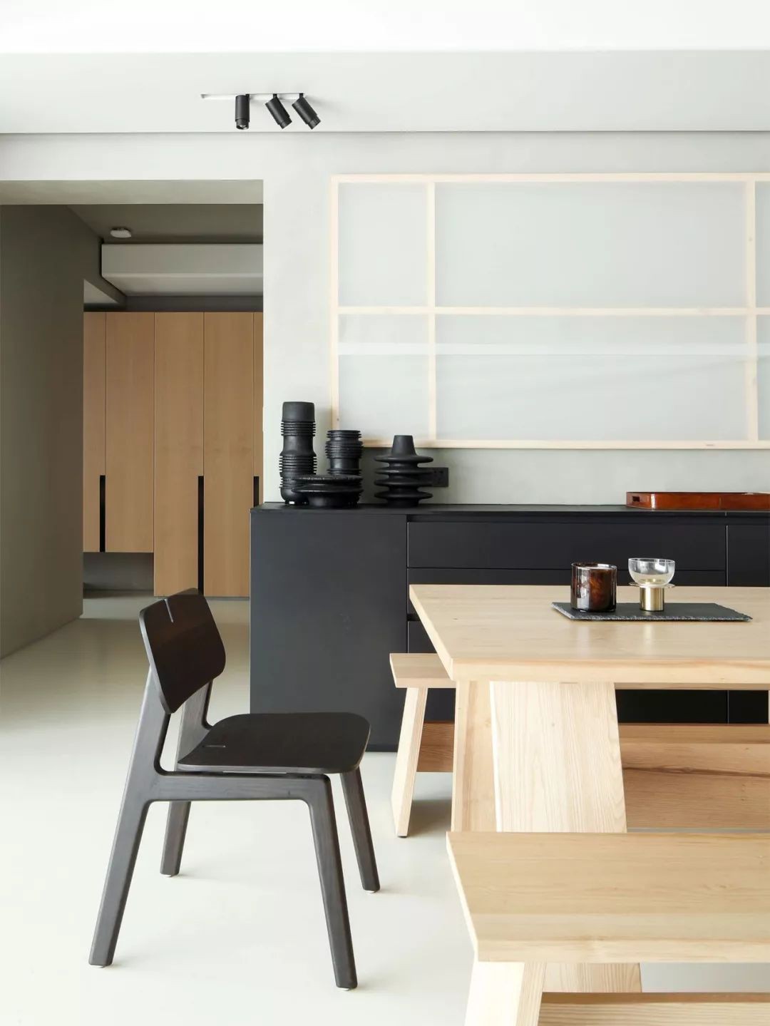 Bên cạnh phòng khách là bộ bàn ăn xinh xắn. Không cầu kỳ với các loại ghế đơn, anh Gu Teng chọn cho mình phương án giản dị nhất trong từng đường nét nội thất và thiết kế. Anh sử dụng ghế dài bằng gỗ thịt để tăng thêm nét đẹp thân thiện và gần gũi cho không gian vốn dĩ có vẻ đẹp gọn gàng và hiện đại.