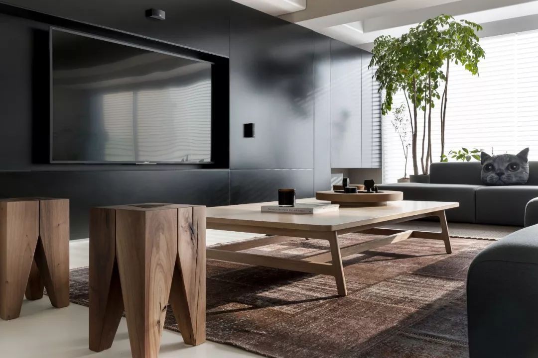 Bức tường phía trước sofa là nơi đặt tủ âm tường và tivi. Không sử dụng kệ như cách làm thông thường, toàn bộ bức tường màu đen với các ngăn tủ gọn nhẹ, tivi đặt ở vị trí trung tâm đủ để không gian sống thêm nổi bật cá tính.