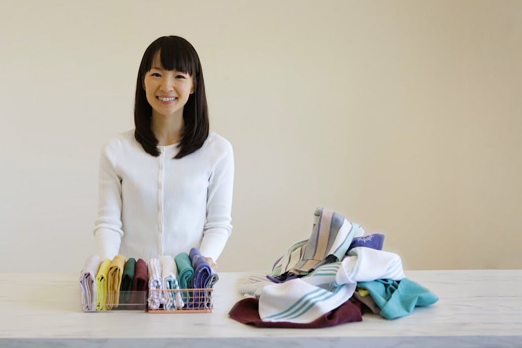Và dưới đây là cách Marie Kondo hướng dẫn cách sắp xếp lại đồ dùng nhà bếp. Cô ấy hướng dẫn xếp loại từng đồ dùng nhà bếp, từ việc gấp khăn vuông vức và xếp vào từng ô kệ sao cho chuẩn xác, gọn gàng. Thật không có gì đáng ngạc nhiên khi Marie Kondo là tác giả của cuốn sách bán chạy nhất có tên The Life-Changing Magic of Tidying Up, đồng thời làm nghề hướng dẫn mọi người trên toàn thế giới về cách tổ chức và dọn dẹp nhà cửa.