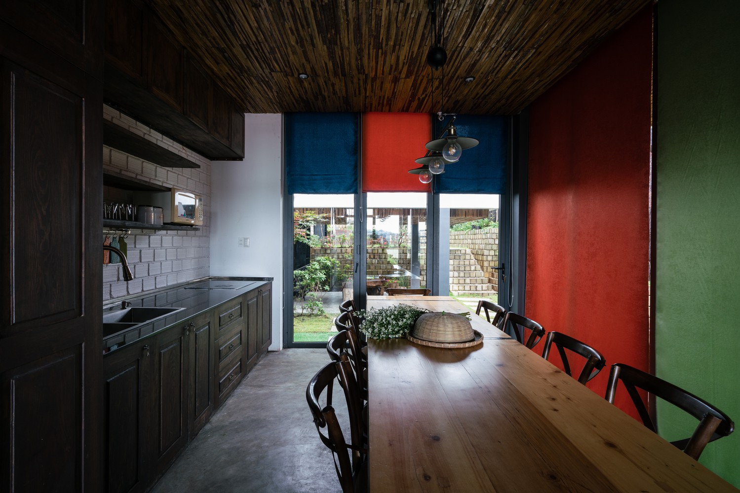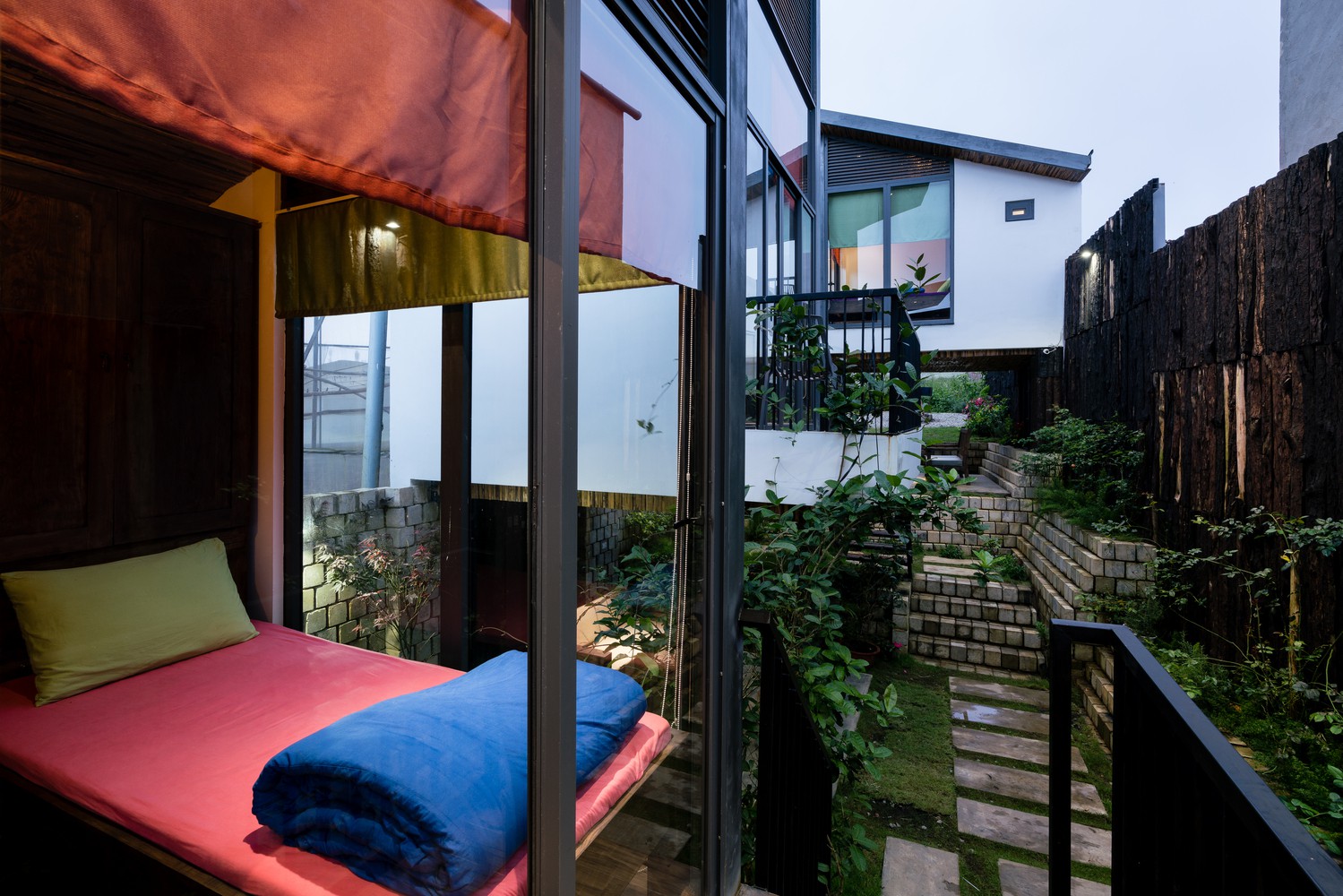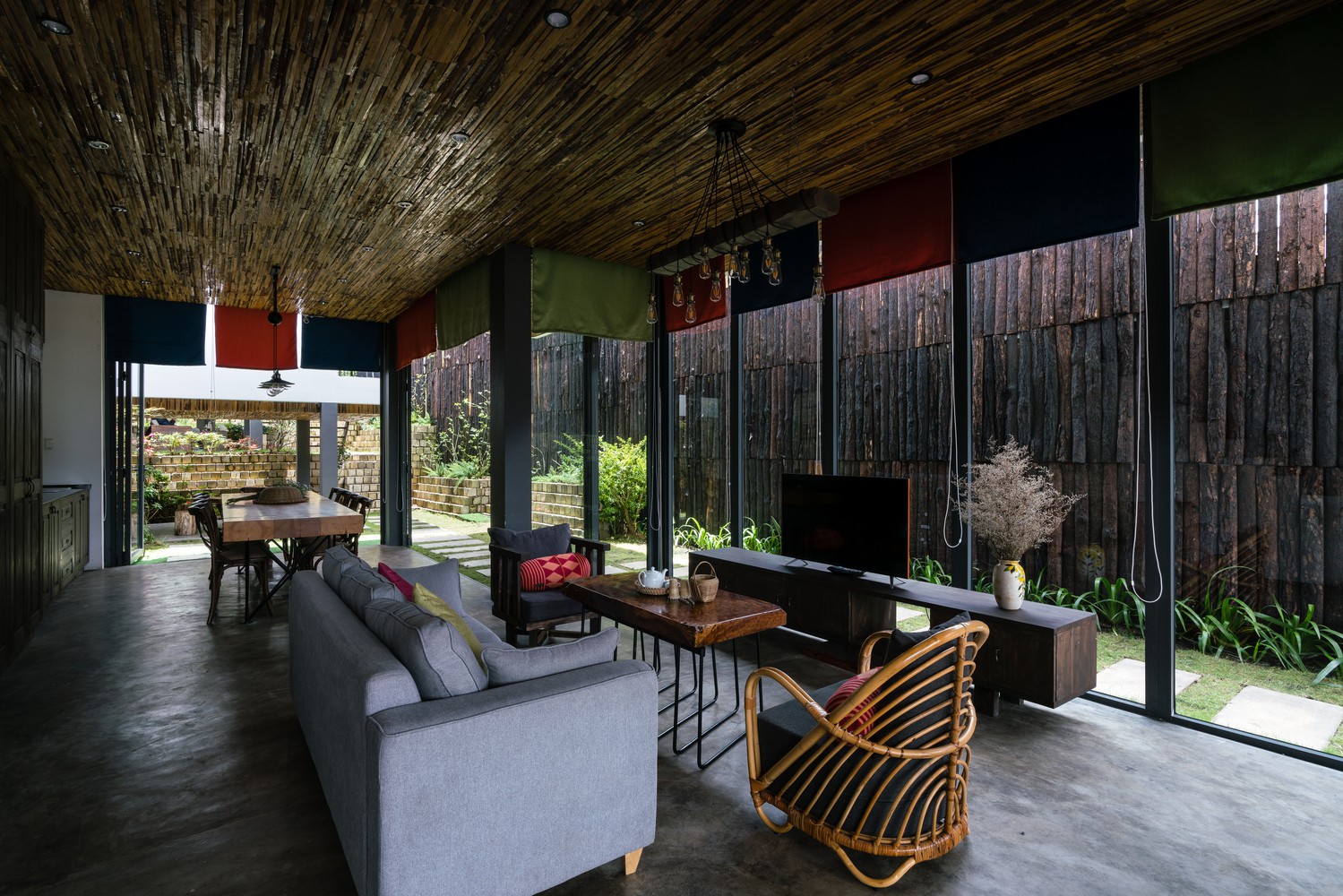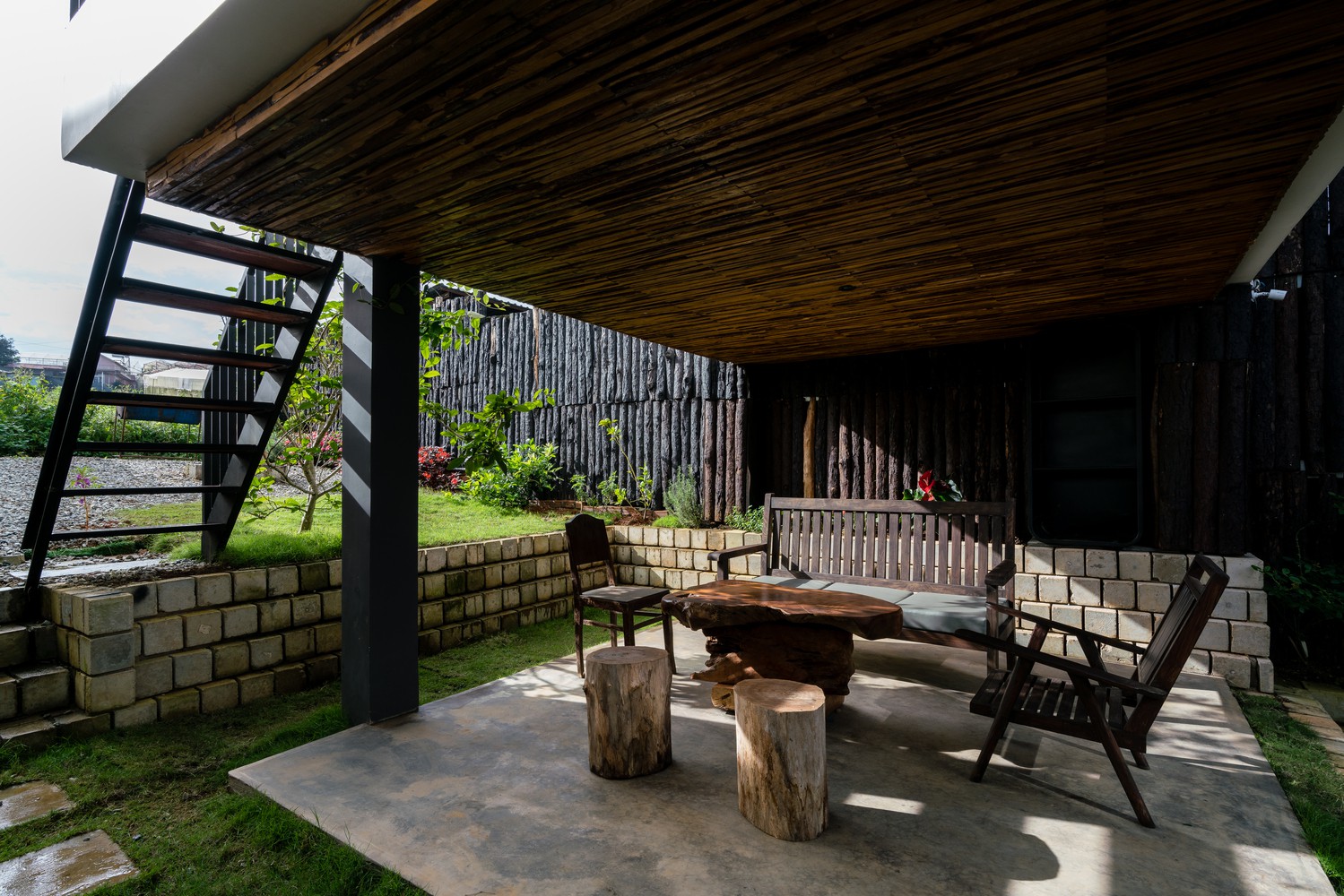 Yếu tố làm nên vẻ đẹp đặc biệt, độc đáo cho ngôi nhà chính là phần trần và hàng rào được sử dụng vật liệu bỏ đi, đó chính là những gốc cây, những cành cây, thanh gỗ được xử lý chống ẩm mốc. Bên cạnh đó, lối đi hay phần sân kết nối giữa các cabin, gạch ốp một phần lối đi đều được tận dụng từ những công trình cũ ở địa phương.