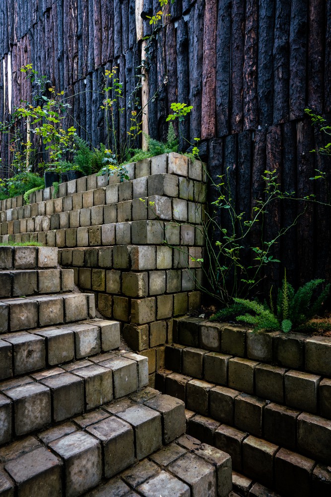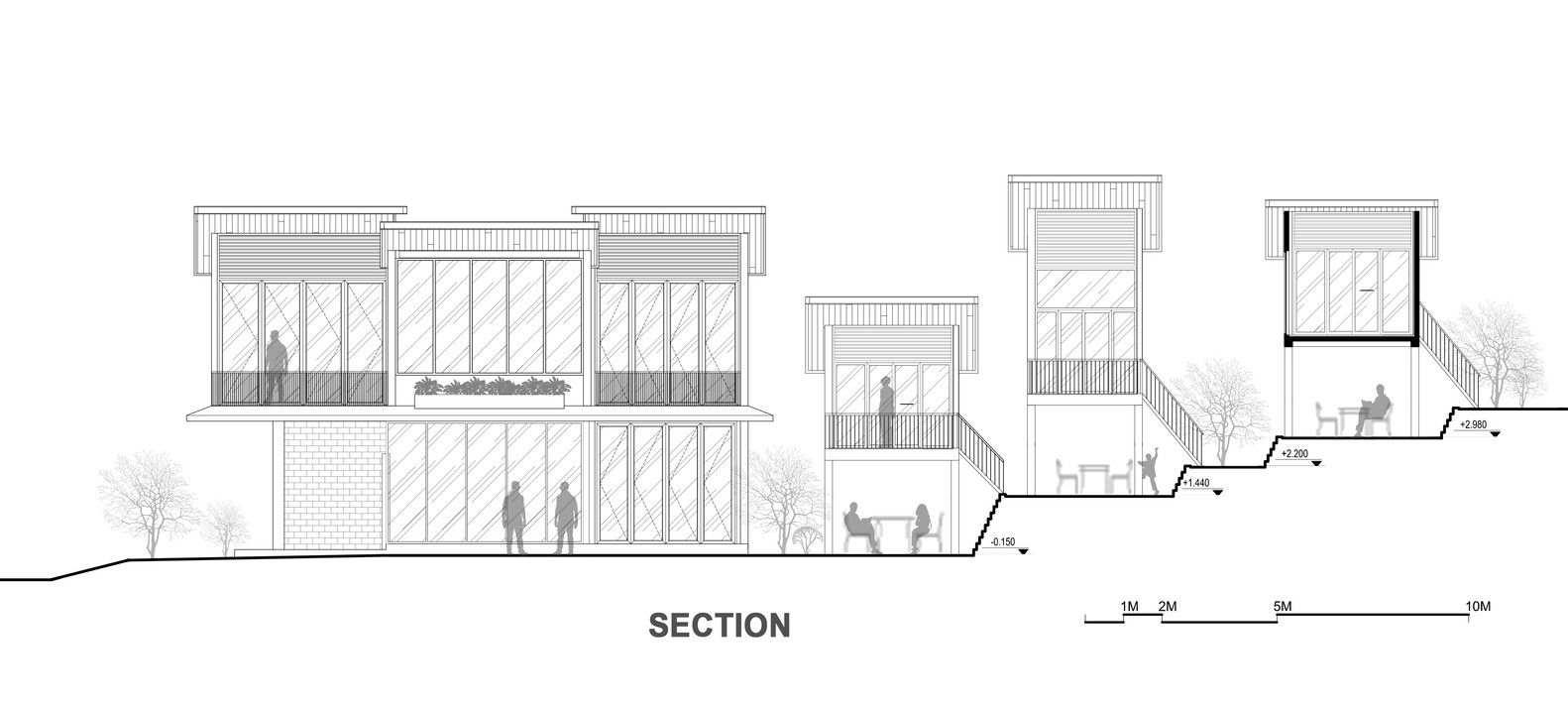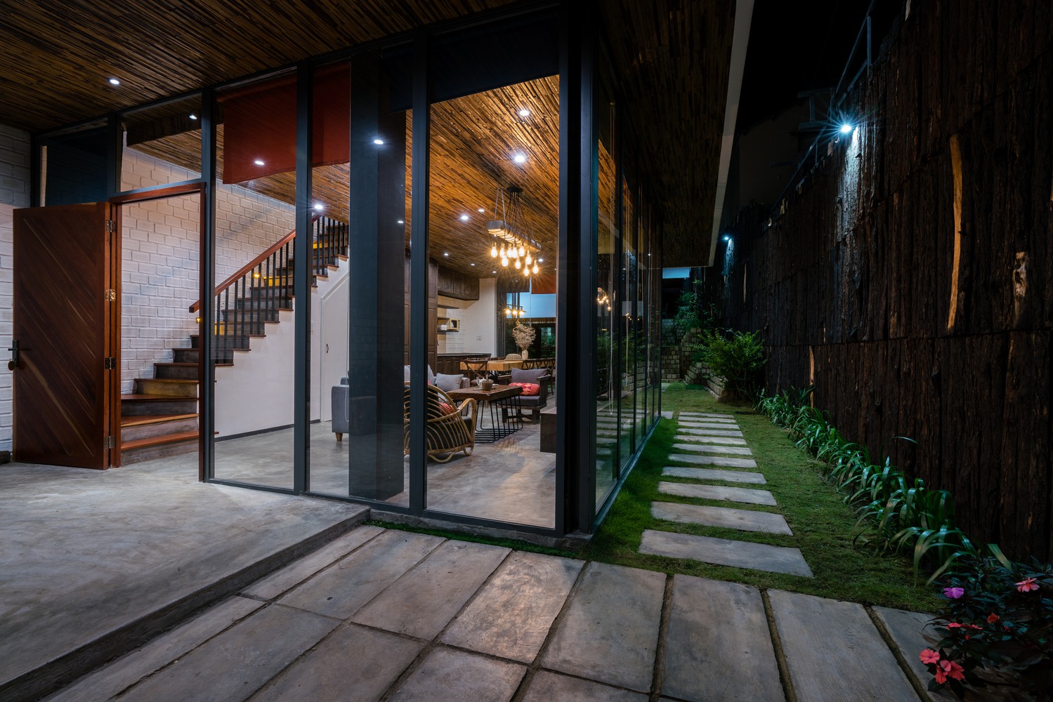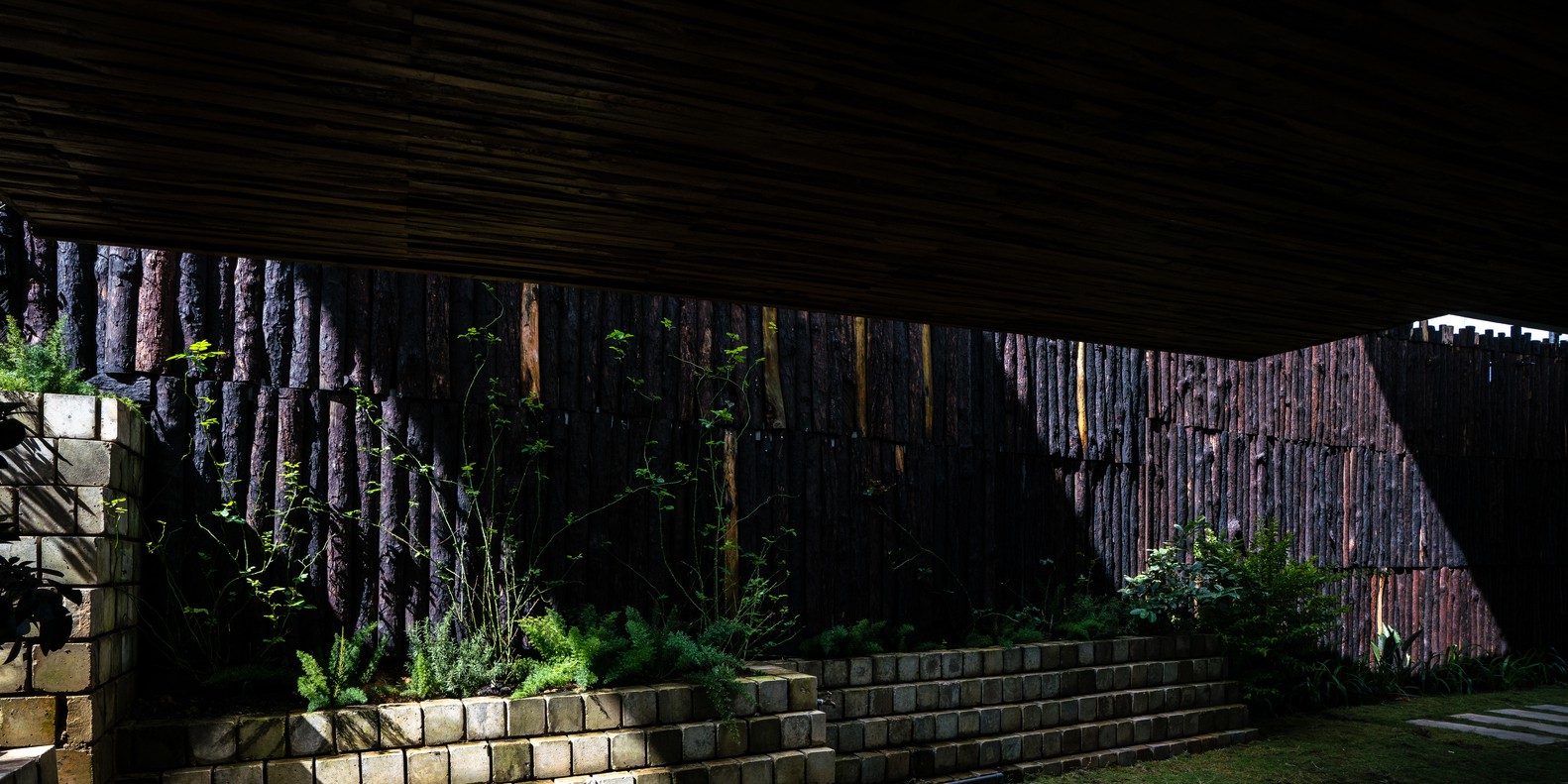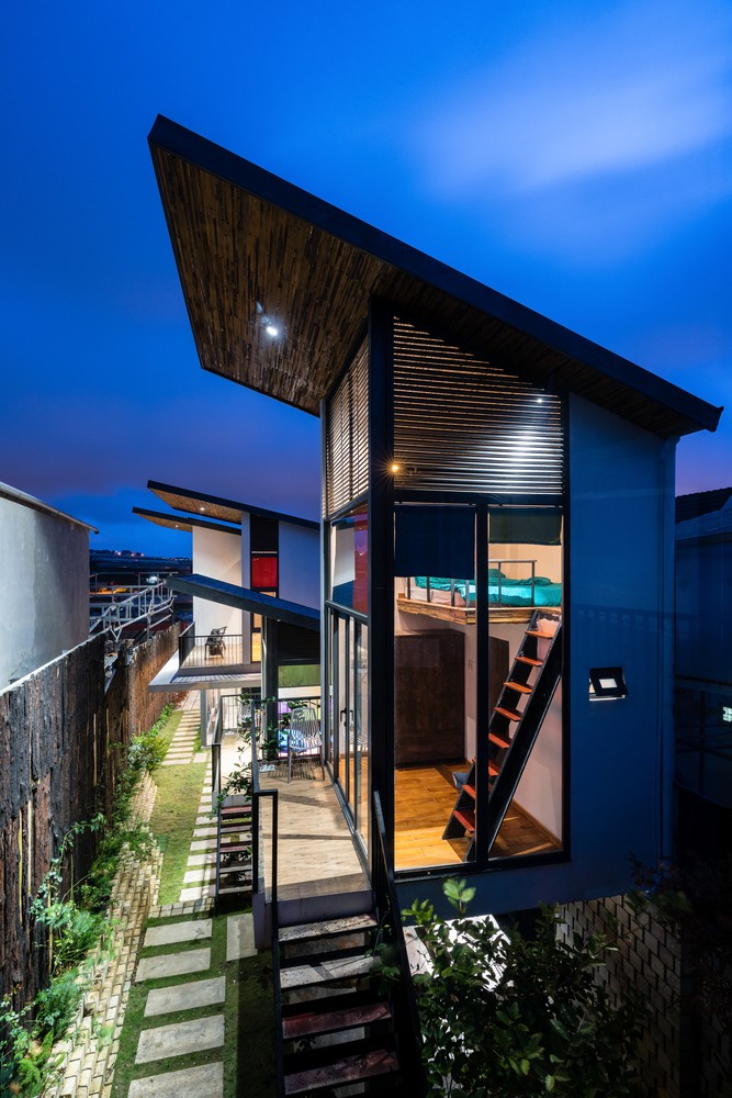 Yếu tố làm nên vẻ đẹp đặc biệt, độc đáo cho ngôi nhà chính là phần trần và hàng rào được sử dụng vật liệu bỏ đi, đó chính là những gốc cây, những cành cây, thanh gỗ được xử lý chống ẩm mốc. Bên cạnh đó, lối đi hay phần sân kết nối giữa các cabin, gạch ốp một phần lối đi đều được tận dụng từ những công trình cũ ở địa phương.