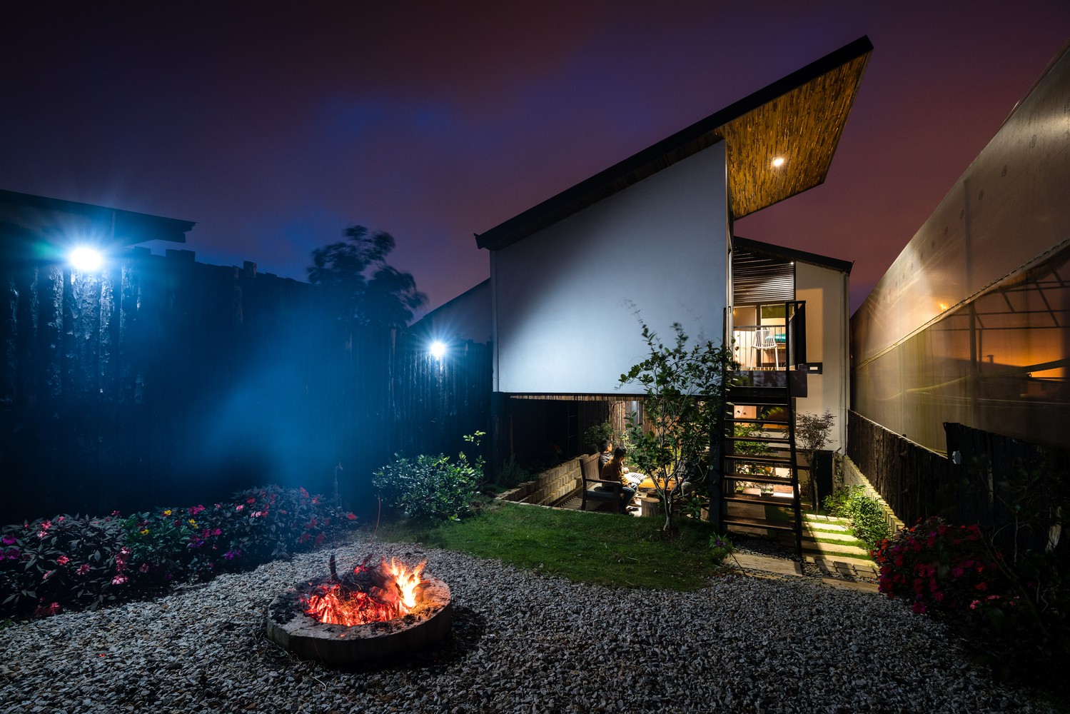 Phần cabin được xây dựng vô cùng ấn tượng lấy cảm hứng từ nhà sàn. Các KTS đã khéo léo "định hình" không gian bằng cách ốp gạch gốm xung quanh một phần tường rào dọc lối vào nhà và phần tường bao quanh nhà. Bên cạnh còn có lối đi với bước đệm từ cỏ. Những góc nhỏ an yên được bố trí ngay phía tầng 1, nơi chẳng cần đến tường, chỉ cần một bộ bàn ghế từ chất liệu gỗ tự nhiên là đủ để có một không gian thật đẹp, ngắm nhìn ngoại cảnh và tận hưởng khí hậu thay đổi theo giờ của Đà Lạt.