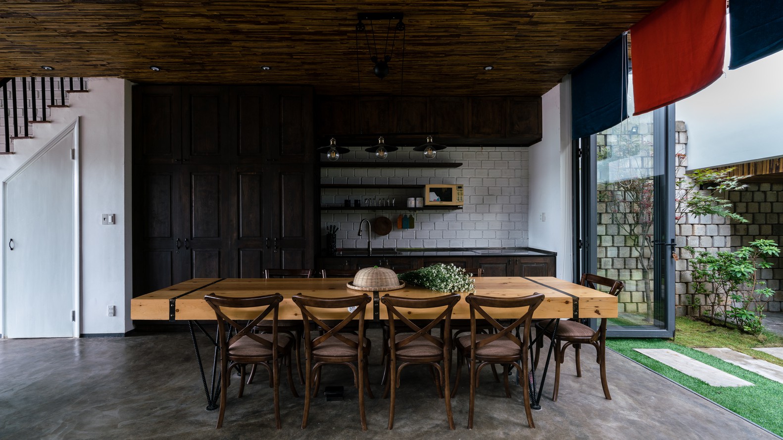 Phòng khách được thiết kế đơn giản, đủ đầy với nội thất như sofa, bàn trà và kệ tivi theo phong cách đương địa. Góc ăn uống được bố trí liền mạch với khu vực tiếp khách. Bàn ăn khá rộng đủ để bố trí cả bữa tiệc trong nhà.