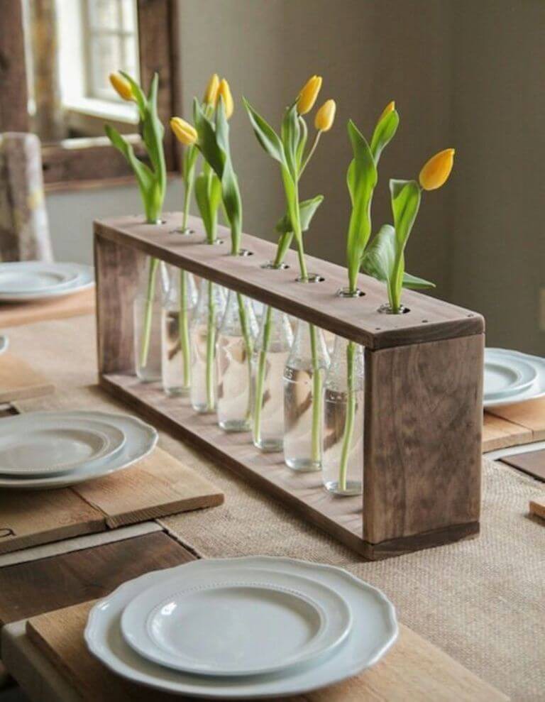 Tận dụng kệ gỗ vứt đi, bạn có thể khoan thành lỗ tương ứng miệng lọ thủy tinh để cắm hoa đầy nghệ thuật.