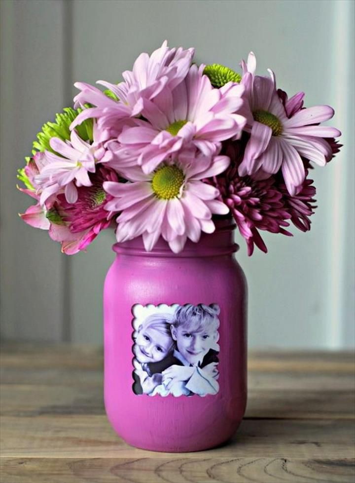 Tận dụng những chiếc lọ nhỏ nhắn in ảnh của con cái bạn trên đó, hãy cắm thêm vài bông hoa thược dược bên trong. Chiếc lọ sẽ thêm phần nổi bật và không gian trong nhà thì muôn phần ấm cúng hơn.
