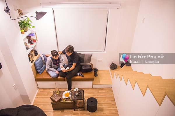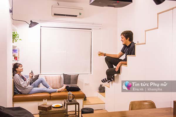 Nằm nép mình dưới chân cầu thang sẽ là tủ quần áo, giúp cho căn hộ được gọn gàng hơn. Điểm nhấn trong toàn bộ không gian còn là khu vực tiếp khách, các vật dụng từ sofa, bàn ghế được lựa chọn một cách khéo léo, linh hoạt di chuyển theo mục đích sử dụng. Bên khung cửa sổ, còn gì tuyệt vời hơn khi bạn có thể thả mình trên đó đọc sách hay hàn huyên mổi khi có bạn đến thăm nhà, hộc kéo cũng được bố trí tối ưu hóa kể cả dưới sofa.