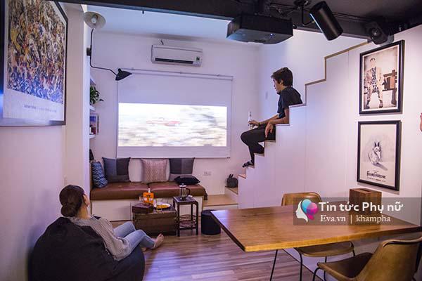 Nhỏ nhưng vẫn đầy đủ tiện nghi và mang yếu tố giải trí cho gia chủ, căn phòng được trang bị hệ thống máy chiếu và âm thanh trở thành một phòng xem film gia đình. Gác nhỏ được bố trí là giường ngủ gọn gàng ấm áp cho giấc ngủ dịu êm.