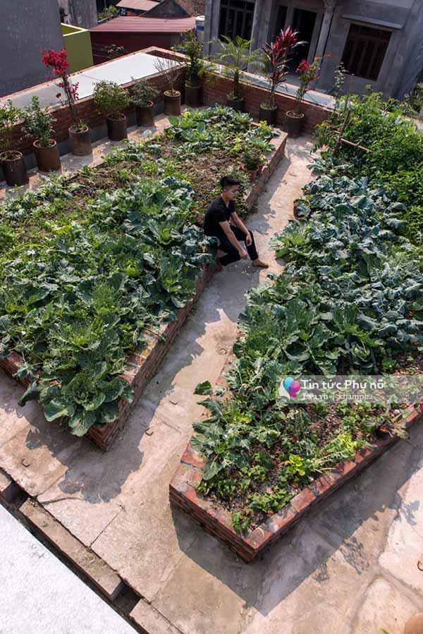 Tổng thể của căn nhà được tạo nên bởi hai lớp tường bằng gạch nung chạy khép kín qua một nút giao nhau, xen kẽ giữa chúng là các mảng cây xanh, rau, củ, quả,..